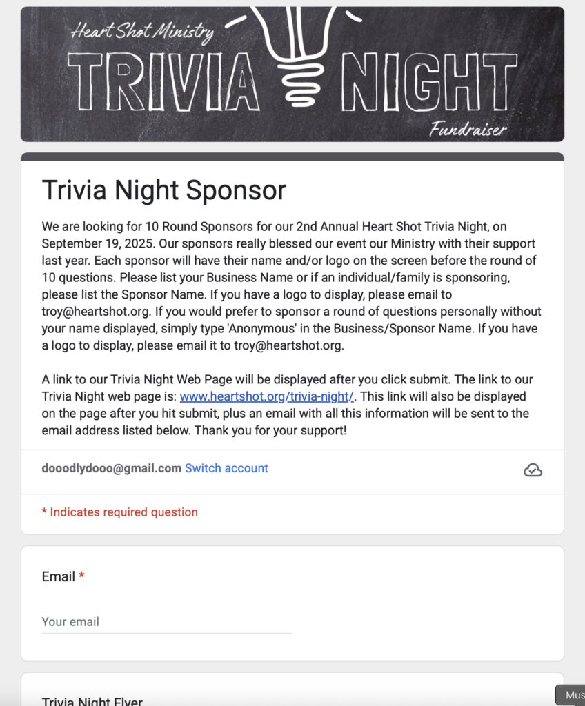 Trivia Night Sponsors! Please complete the above sponsorship form How Many? (You can also change quantity during checkout) Single $10.00 USD Table $80.00 USD Round Sponsor $100.00 USD Team Name or Sponsor Name